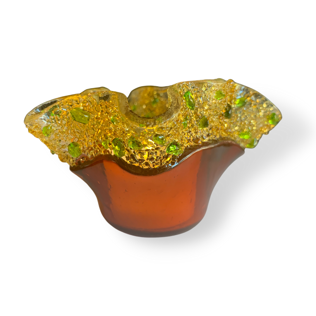 Madrona Votive – This votive is inspired by the warm spice color of the Madrona trees that line the coast of the San Juan Islands. Darleen Nixon, the artist, has added a flourish of contrasting accent colors of spring green and golden glass to the rim of this attractive votive.