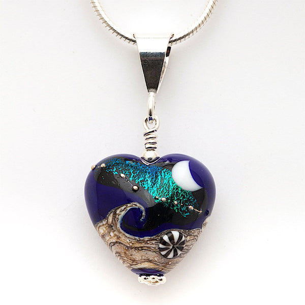 Moon - An enticing combination of moon and sea is created in this complex heart design. Silver beads are melted into the hot glass to represent the stars across a sky of dichroic glass. Dream on! Hearts are 3/4" across. Choose from an 18” or 20” sterling silver snake chain.