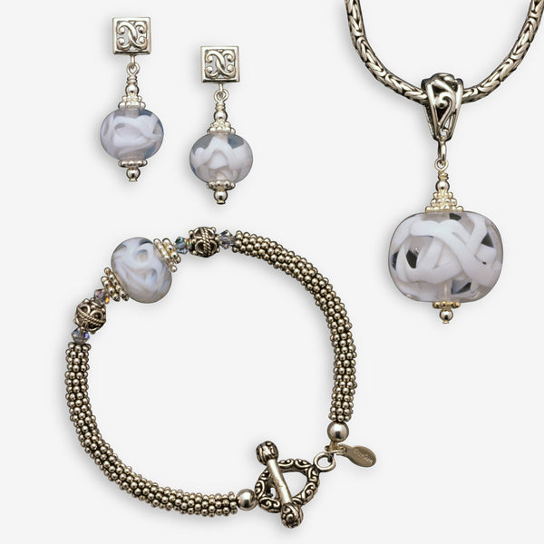 Layers of white ribbons of glass weave through the transparent clear Murano glass for a mysteriously elegant look. This graceful presentation of hand sculpted glass wears well with any design. See the individual pieces of the Snow Tracks collection See all Art Glass Jewelry Collections