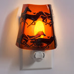 Horses Nightlight - Horses are created with black powdered glass as they stampede across the vibrant transparent red glass. Each night light is an original work of art. The design is created using a base of hand-cut glass. Glass powders and shards of glass are applied to complete the final...