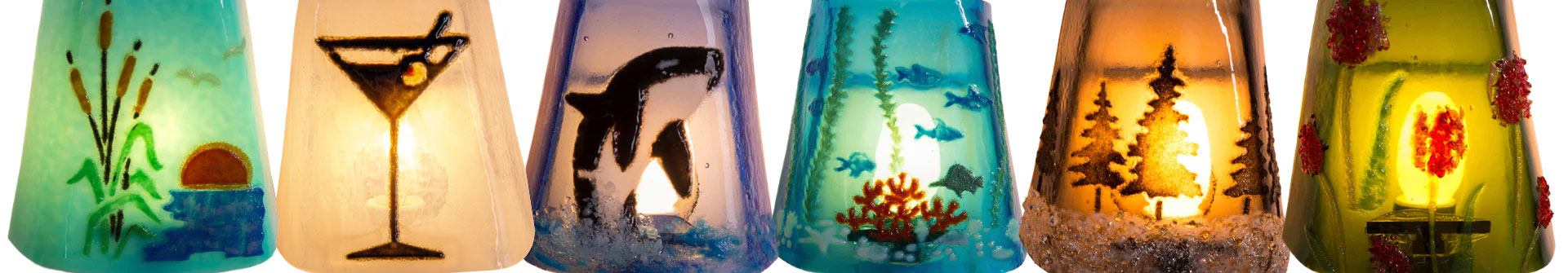 Each nightlight is an original work of art.  The design is created using a base of hand-cut glass.  Glass powders and shards of glass are applied to complete the final design.  The glass powders and shards are fused together and annealed in a kiln for strength and durability.  The fused piece is then slumped in the kiln to achieve the curved form that will surround the bulb.