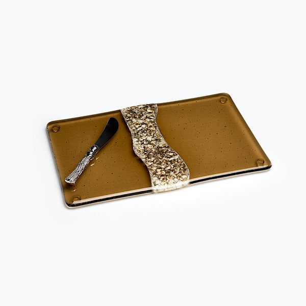 River Rock - The River Rock serving platter is made through a complex process of creating a “part sheet” formed of ivory-colored glass shards combined with reactive glass powder. This mixture is fused in the kiln creating the look of “River Rock”. The part sheet of “River Rock” is then cut with a diamond bit ring saw to create the curved flow of the river. The curved “River Rock” piece is then fused between two pieces of hand-cut transparent bronze glass to create the final art glass serving platter. A stainless steel knife is included. Each platter is signed by the artist. Measures 11” x 7”. Food safe - Hand wash - No microwave.