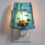 Sealife Nightlight - Sealife appears in magical colors of powered glass fused onto a transparent turquoise glass background. Each night light is an original work of art. The design is created using a base of hand-cut glass. Glass powders and shards of glass are applied to complete the final design....