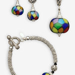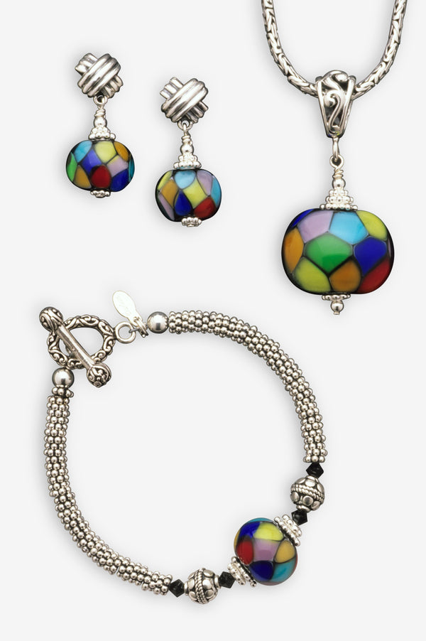 The bright mosaic of glass in this unique design is reminiscent of the Carnival of Venice. The artist individually sculpts each color of Murano glass to create this contemporary jewelry that is versatile enough to be worn with anything.