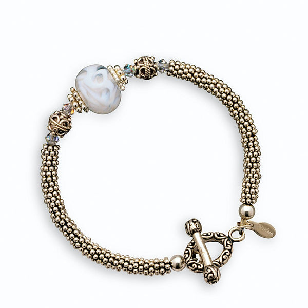 Snow Tracks Bracelet - This bracelet combines sterling silver beads with Swarovski crystals that frame the art glass bead. 7 ½” length - sterling silver toggle clasp.
